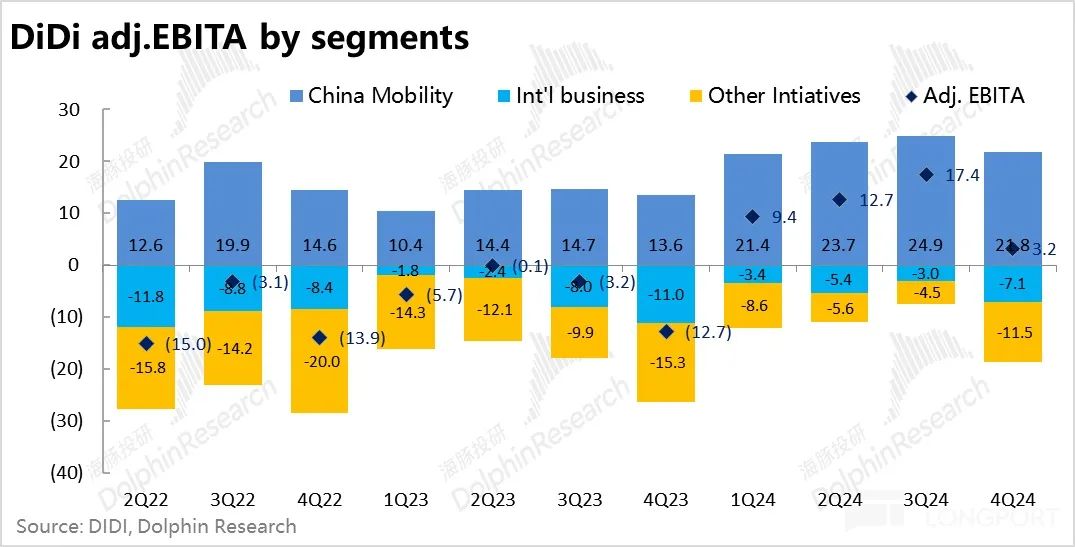 由于海外和新业务亏损的明显扩大,滴滴整体本季的 adj.EBITA 为 3.2 亿,不足上季 17.4 亿的零头。需要特别关注本季海外和创新业务的亏损扩大仅还是因为季节性波动,还是因海外再投资带来的趋势性亏损扩张。