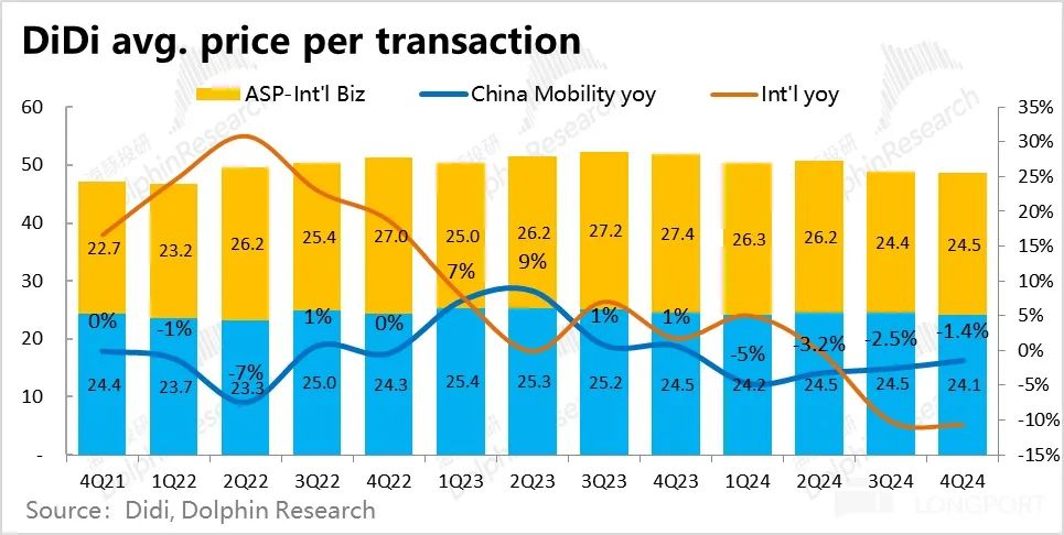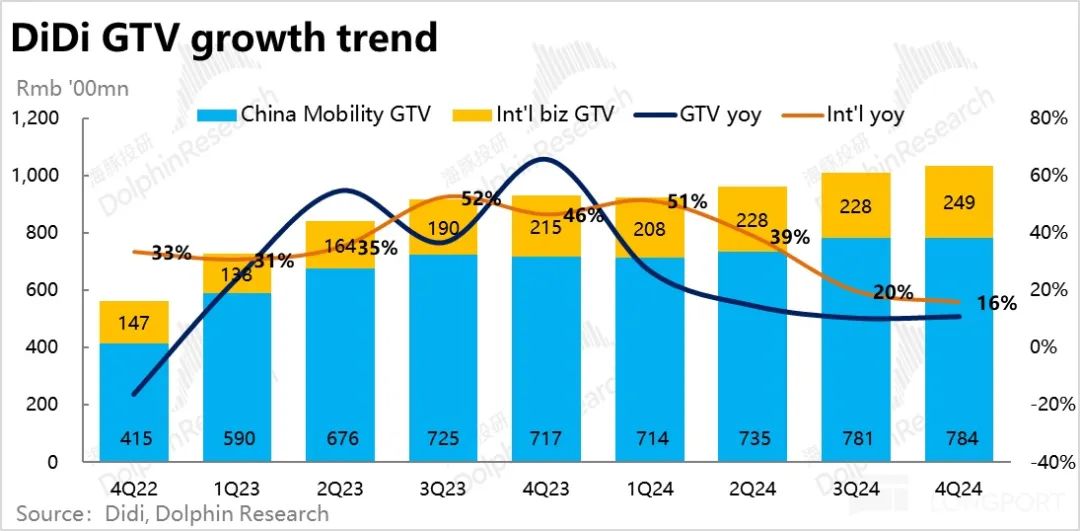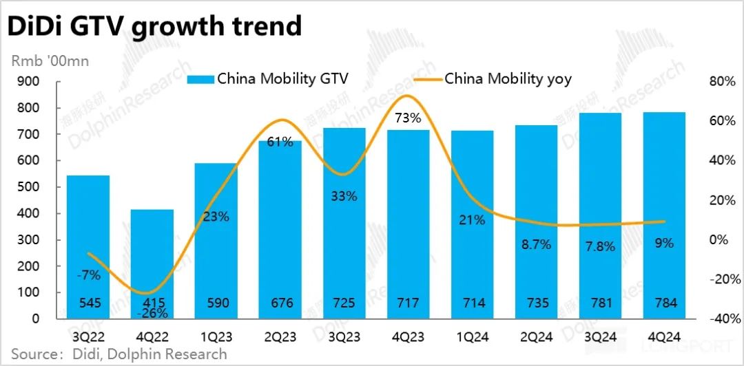 核心运营数据上,2024 年 4季度滴滴国内出行实现 GTV 784 亿,同比增长 9.3%,较上季小幅加速 1.5pct,体现出滴滴在国内网约车行业的领先地位进一步稳固。