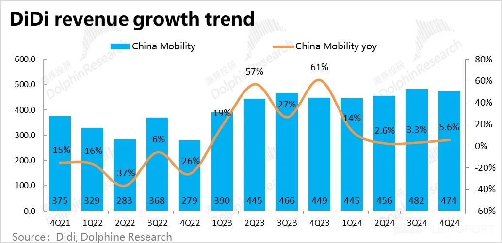营收角度,滴滴国内出行板块本季收入 474 亿元,同比增长 5.6%,和 GTV 趋势一致较上季稍有提速,但依旧跑输了 GTV 约 9% 的增速。