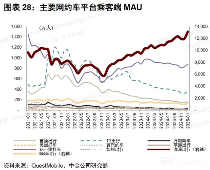 不过根据第三方调研的用户端 App MAU 数据24 年底到 25 年初,滴滴自身 App 和旗下花小猪 App 的用户月活都出现了明显向上拉升的情况,而其他各平台都没有如此显著的变化。看起来同样验证了滴滴在国内市场的领先地位或市占率有所走高。