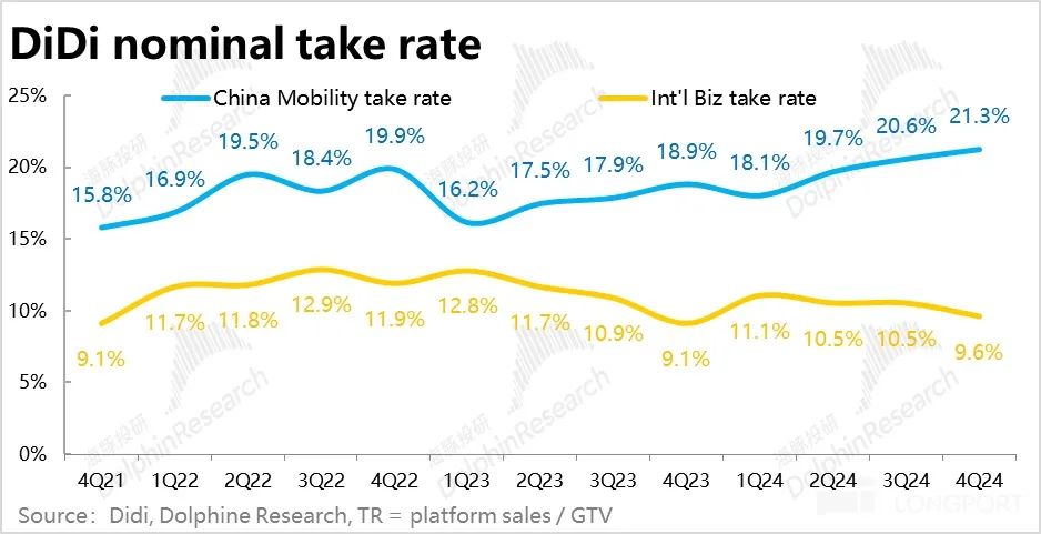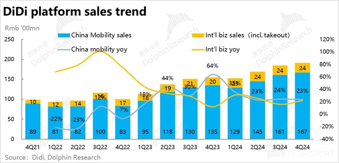 而另一个方向相反,但同样持续了一段时间的情况是,滴滴国内的平台销售额增长则依旧大幅跑赢 GTV 和收入增速,本季为 23%,较上季的 24% 稍有放缓。