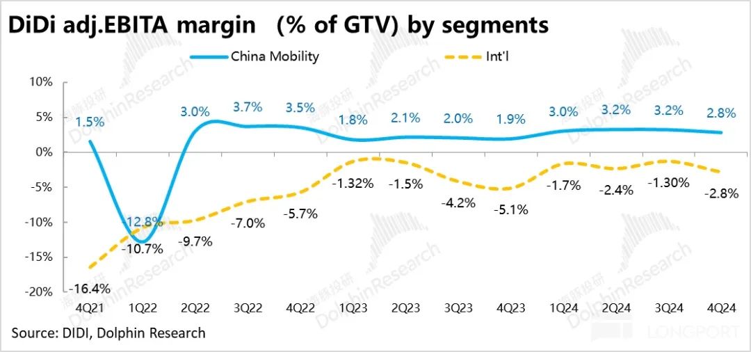 4、利润指标上,滴滴国内板块调整后 EBITA 利润本季为 21.8 亿,环比上季度下降了约 3.1 亿。Adj.EBITA 利润占 GTV 的比重较上季的 3.2% 小幅下降到 2.8%。虽然4Q 是季节性淡季,利润率环比略降具备一定合理性,但对期待滴滴的利润率能继续改善的投资者而言,显然不是好消息。