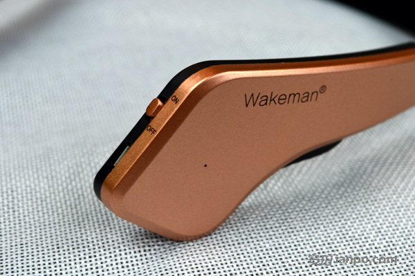 Wakeman功能按键基本都位于右则处,包括有电源开关on/off,LED状态指示灯,音频输出口/电源充电接口。
