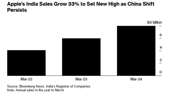 所以,截至今年3月的一年里,苹果在印度就赚了近80亿美元,比去年同期的60亿美元猛增约33%,创历史新高!!