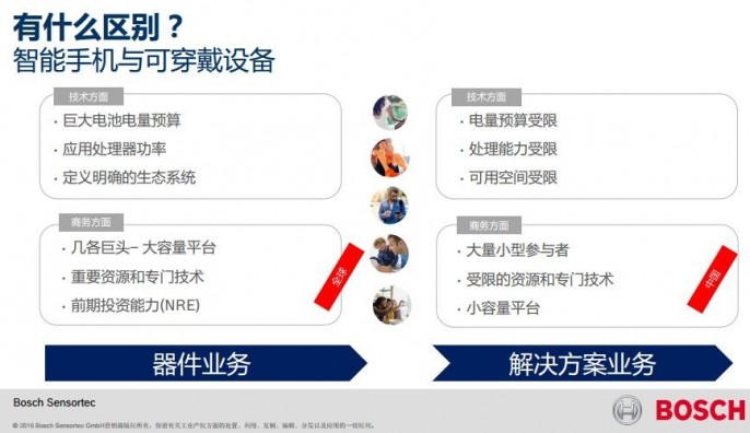 博世是全球排名第一的MEMS传感器供应商,Bosch Sensortec 是博世集团在2005年为满足消费电子MEMS市场需求而成立的。随着市场的不断变化,博世致力于技术的演进和品质的开发,推出的产品越来越小、越来越多元化。对于智能手机与可穿戴设备对于传感器需求的不同,百里博先生表示:“具体而言,智能手机可能会需要比较大的电池电量预算,或者是应用处理功率要高一些,而且它的生态系统相对成熟。对于可穿戴设备来讲,是完全不一样的生态,包括电量的预算更受限,它处理能力也不那么强大。”
