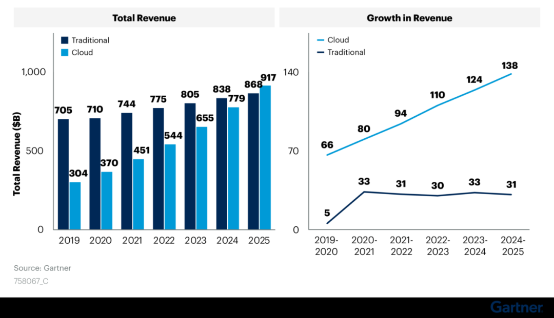 根据市场研究机构Gartner的分析,公有云正处于“陡峭”的增长阶段,尤其在疫情期间,企业对于数字化转型的需求与日俱增。根据预测,在2022年,传统IT的增速为4%,而云计算的增速则高达17%。