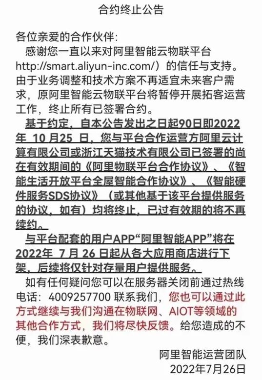 7月26日,阿里智能运营团队发布公告,原阿里智能云物联平台将暂停开展拓客运营工作,终止所有已签署合约。