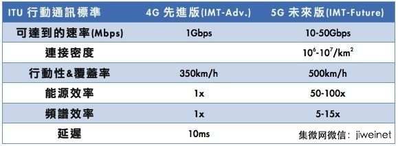 市场或业界对于行动网路技术的三个新需求——亦为对5G技术的新要求——传输速率更快速行动宽频、高效能且低延迟,以及支援机器间的通讯。而这三项需求看似目前的4G已可满足,但实际上却相当严苛。根据国际电讯联盟(ITU)公开5G的网路标准,其传输速度为20Gbps,目前最快的4G网路传输为150Mbps,这即为上述更快速传输速率的需求。低延迟的需求是指资料从A点传输至B点时,在最慢1毫秒(ms)及99.999%的时间点内就得完成;而支援机器间通讯的需求即是M2M。
