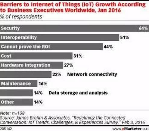 据James Brehm & Associates于2016年1月发布的针对全球企业高管关于物联网成长中的障碍的调查结果,安全是最大的阻碍物联网发展的因素。