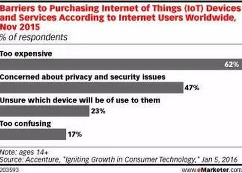 对问题需要兼听多方调查。下面看一下Accenture于2015年11月发布的针对全球网民关于采购物联网设备和服务障碍的调查。