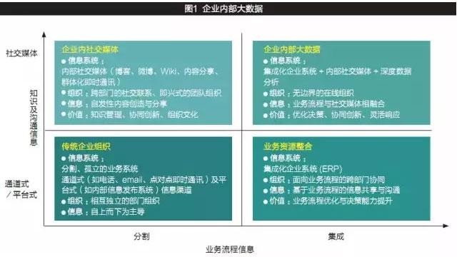 在集成化企业系统、内部社交媒体以及深度数据分析技术的共同支撑下,杰克?韦尔奇所畅想的“无边界组织”在新兴环境下成为可能,并被赋予了新的内涵。部门边界、层级边界被紧密的业务联系和广泛的社交联系所弱化,结构化的业务流程信息与非结构化的知识及管理活动信息被多维度融合的深度数据分析能力连接在一起,从而使企业真正具有驾驭内部大数据的能力。