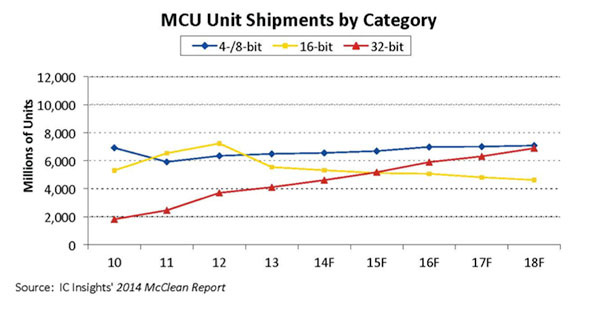 8位/16位/32位MCU出货量数据(IC Insights,2014)
