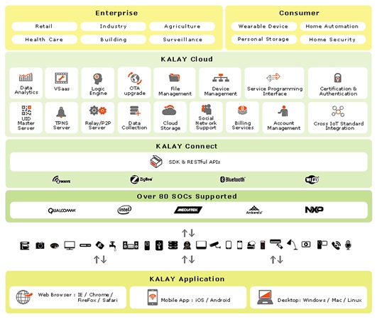 在参观台湾智慧城市展时,小编还认识了一家企业恰巧就是做这两件事的。这家企业叫物联智慧(ThroughTek),因为印象深刻,所以请允许小编调侃一句:这是一家做“软”饭很好吃的公司。他们公司的核心是Kalay云平台,Kalay这个词是台湾原住民方言,意为“牵手”,非常形象的解释了公司的业务。即通过Kalay云平台,为其客户端和设备端之间提供跨平台跨操作系统的的连接,再根据客户的需求,建立大数据存储与分析等云端服务,为企业与终端消费者分别设计定制化的模组服务。物联智慧将其平台细致成超过12种不同云端功能的模组,让不同商家针对其需求选择功能模组,更可开放API与其他第三方平台对接,多样的组合能创造出千变万化的物联网应用,这就是物联网的核心价值,硬件只是传感器和执行器,真正能为客户带来价值的是云端的多样性服务。