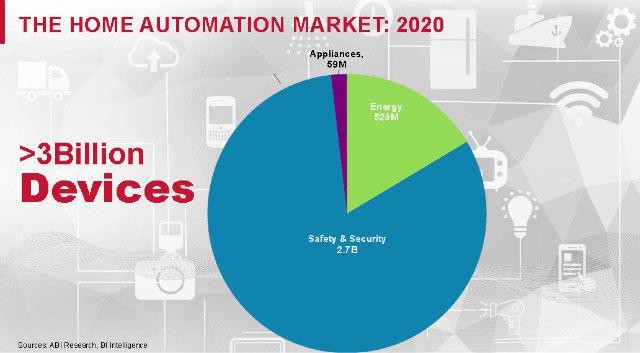 至于对2020年家庭自动化市场的预测,Hurlston引用了ABI Research和BI Intelligence的数据,“预计将达到30亿台的数量,而且大部分会通过无线方式进行互联。而且,在未来的几年内,这类设备的数量将超过手机的数量。”
