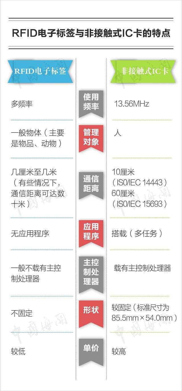 值得说明的是,虽然目前应用较广的非接触式IC卡(如人们常用的第二代身份证、城市交通一卡通等)与一般的RFID电子标签有时会使用同一个频率(13.56MHz),但由于两者与阅读器之间的无线通信协议不同,所以两者无法通用,而我们也不能将两者混淆。不仅如此,非接触式IC卡在通信距离、形状、管理对象、单价等方面都与RFID电子标签有所不同。