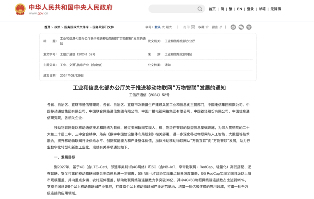 2024年8月工业和信息化部办公厅印发《关于推进移动物联网“万物智联”发展的通知》,通知表示到2027年,基于4G(含LTE-Cat1,即速率类别1的4G网络)和5G(含NB-IoT,窄带物联网;RedCap,轻量化)高低搭配、泛在智联、安全可靠的移动物联网综合生态体系进一步完善。5G NB-IoT网络实现重点场景深度覆盖。5G RedCap实现全国县级以上城市规模覆盖,并向重点乡镇、农村延伸覆盖。移动物联网终端连接数力争突破36亿,其中4G/5G物联网终端连接数占比达到95%。支持全国建设5个以上移动物联网产业集群,打造10个以上移动物联网产业示范基地。培育一批亿级连接的应用领域,打造一批千万级连接的应用领域。