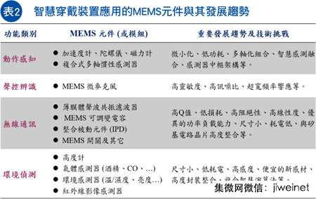 如表2所示,最有机会广泛应用于穿戴行动装置的MEMS元件包括动作感知、声控辨识、无线通讯及环境侦测四大类别。在无线通讯方面,智慧穿戴装置通常需要尺寸微小、并且功耗超低的无线前端模组,来担负穿戴装置系统长期连网与资料传输等工作。