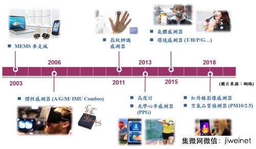 图1 消费性电子产品与穿戴装置应用的热门感测元件及其商品化时程