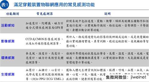 满足穿戴装置物联网应用的常见感测功能如表1,大致可包括活动感知、影像感测、环境感测及生理感测四大类别。MEMS元件在穿戴装置上的应用诉求,是使系统达到微小化、低功耗、高性能及多功能整合等目的;而其最关键的两大功能需求则在于感测与无线通讯。