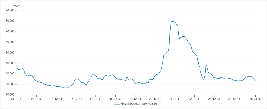 最终,2022年三季度之后,海外库存高企、新增产能释放,草甘膦价格一路回落,到25年中还在2万多元/吨附近徘徊。按照国家统计局公布的数据,其1月底价格还在23000元/吨左右。