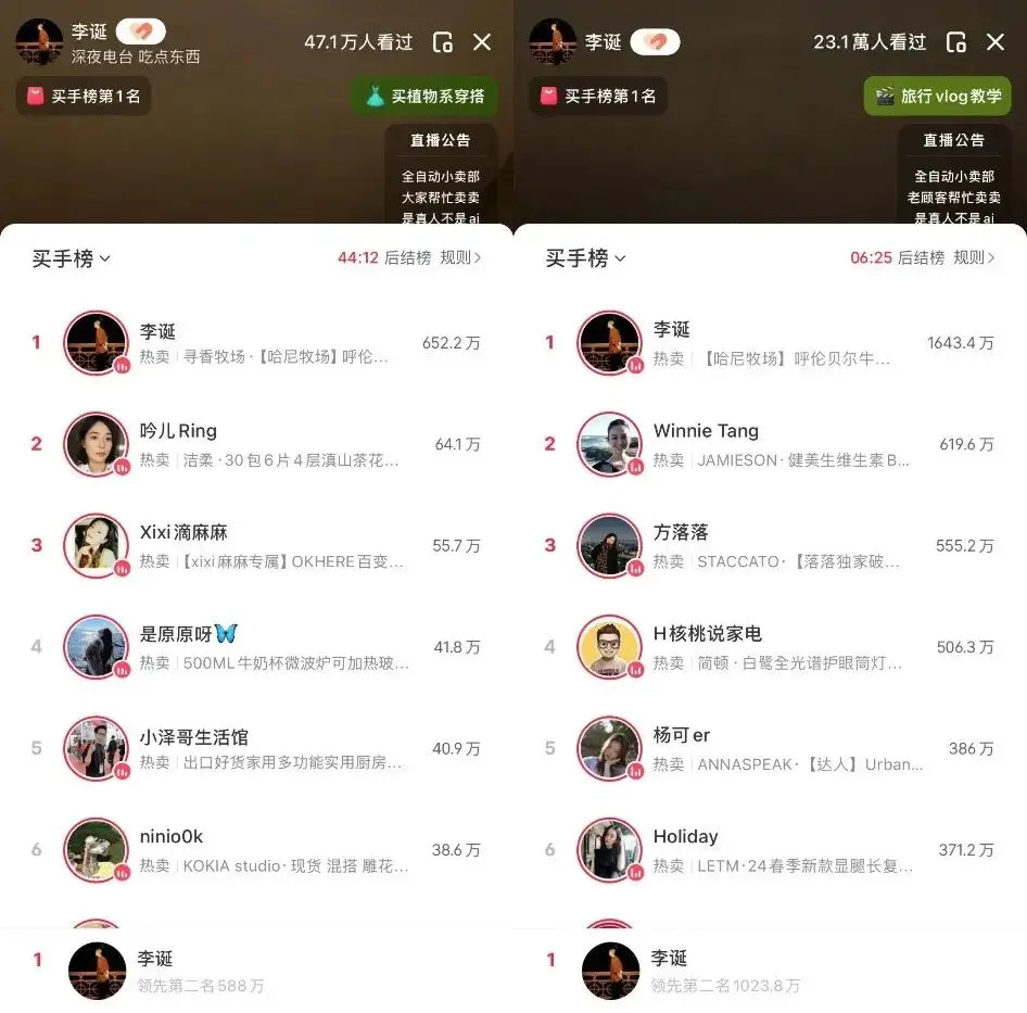 这一点上,李诞的例子或许最为直观,早在2022年,李诞就曾登陆淘宝直播,首秀也创造了超3200万的带货额,但随着后续直播的带货金额降低,其个人在淘宝的开播频次也逐渐减少。而在今年,李诞则又在小红书上卖起了货,并凭借着“情感主播”式的直播火出了圈,多次登顶小红书买手榜第一。