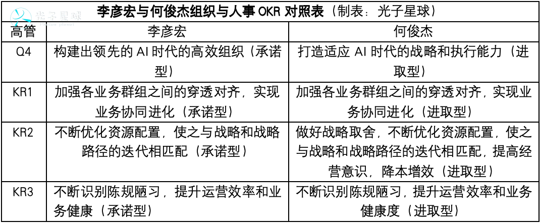 一年后,李彦宏的表述变成了“构建创新驱动的高效执行组织”,由于重点放在组织上,因而去年业务变革巨大,但人事侧平静如水。今年,李彦宏的表述延续了去年的逻辑,相较于人事,更关注组织间的协同。