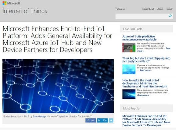 近日,微软正式向公众开放Azure IoT Hub服务,Azure IoT Hub意为物联网中心,是为物联网设备提供注册、管理、沟通的云服务。它是微软Azure IoT Suite的重要组成部分,也是微软物联网战略的重要基础。微软Azure IoT合伙总监Sam George在官方博科表示,IoT Hub是使用者装置和云端服务间的桥梁,允许使用者可以即时存储和分析数据。而IoT Hub也使用MQTT、HTTPS和AMQPS等协定,来提供装置和云端间安全的双向讯息沟通。