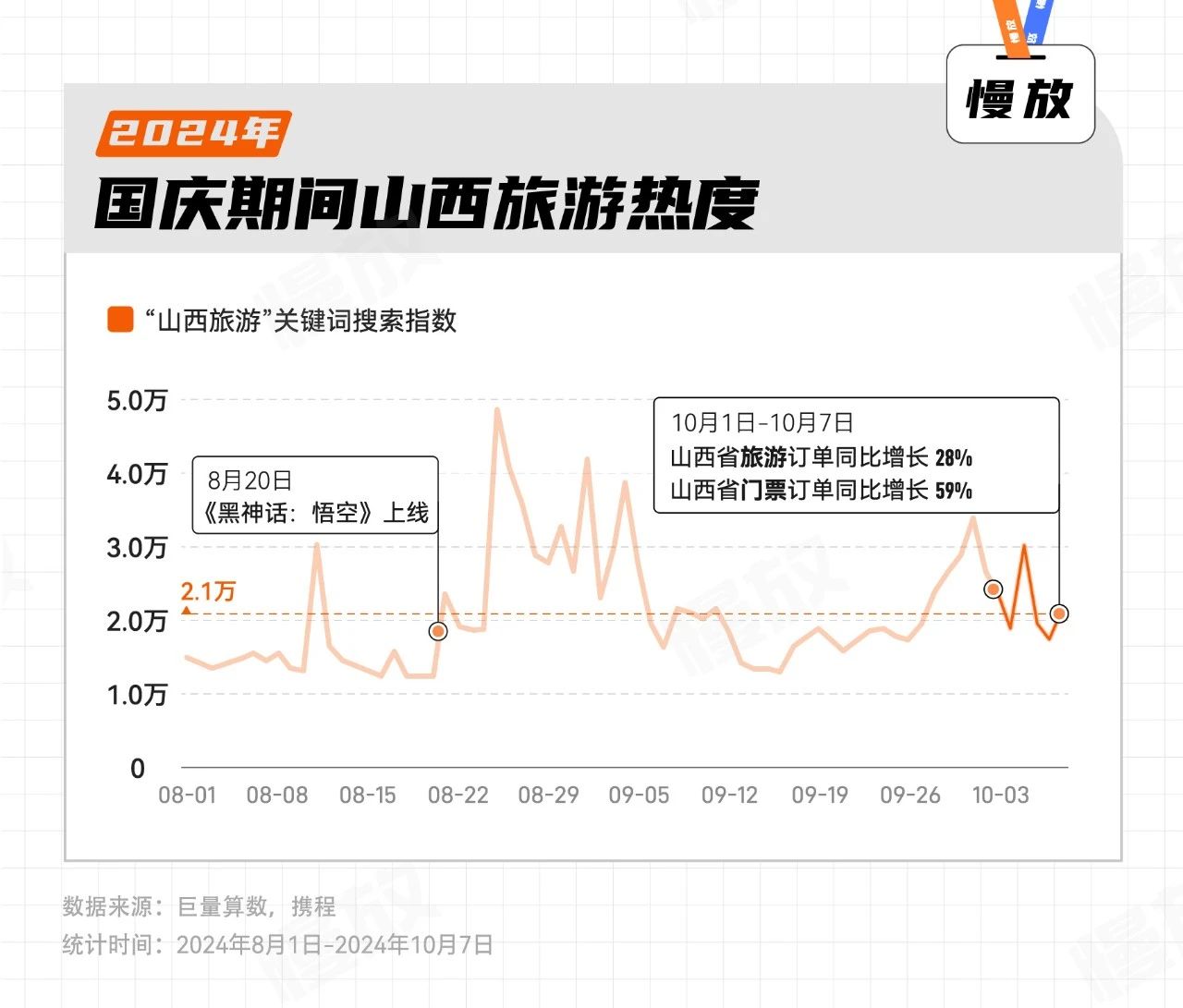 在黑猴的热度下,山西文旅迎来了泼天的富贵。根据巨量算数统计,在黑猴发布后到国庆期间(2024年8月20日-2024年10月7日),“山西旅游”关键词指数同比增长374.6%,到山西亲眼见证天命人走过的路成为了不少年轻人的期望。