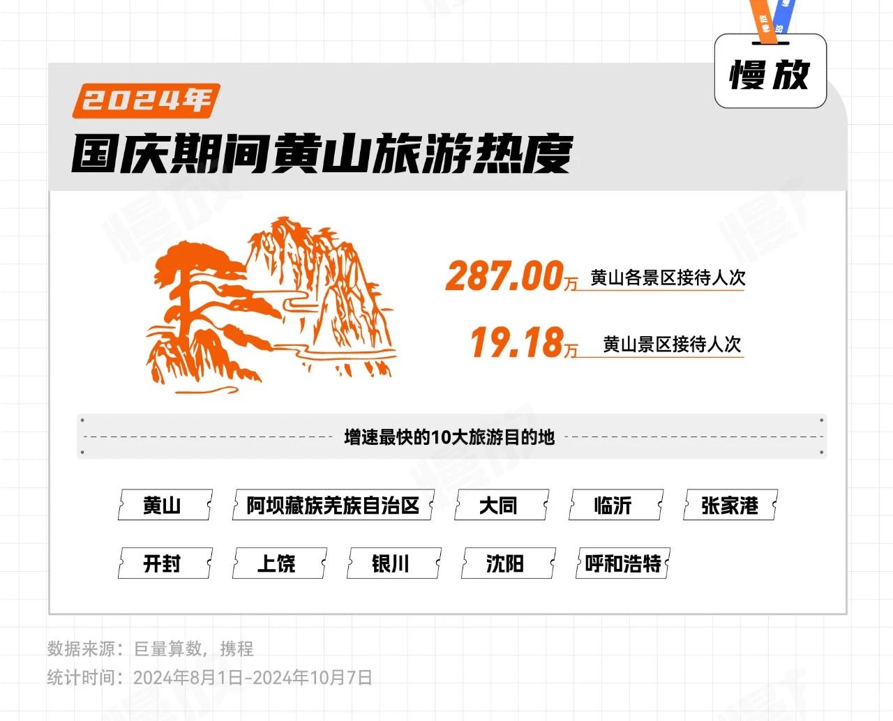 到了国庆假期,大量游客涌入黄山。据中新网安徽新闻从安徽省黄山市文化和旅游局获悉,黄山市各景区度假区街区共接待游客近287万人次,日均口径同比增长35.2%,仅黄山景区就接待了19.18万,同比增长14.15%。在携程的统计中,黄山也成为了今年国庆增速最快的十大热门目的地。
