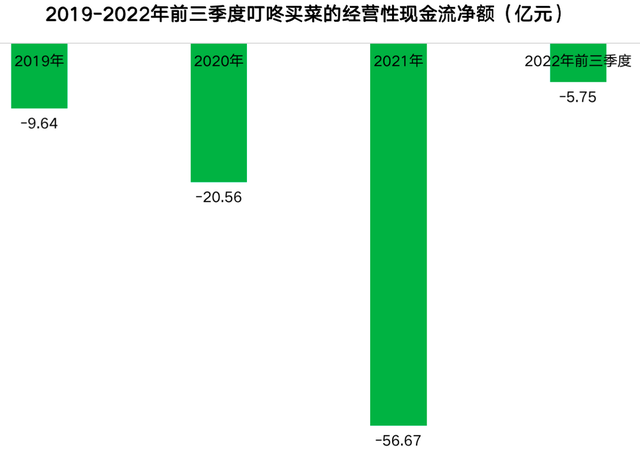 然而,现实却非常残酷,叮咚买菜的现金流一直都不理想。财报数据现实,2019年至2022年前三季度,叮咚买菜的经营活动产生的现金流净额持续呈现流出状态,分别为-9.64亿元、-20.56亿元、-56.67亿元、-5.75亿元,从未实现过正的经营性现金流入。