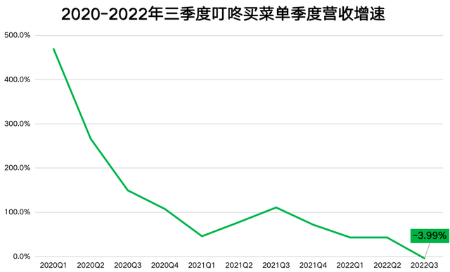 近日,叮咚买菜发布了最新的业绩报告,其中显示,今年第三季度,叮咚买菜实现营收59.4亿元,较2021年同期的61.9亿元,同比下滑了4%。这也是叮咚买菜的首次营收出现下滑,且2021年三季度以来,其营收增速已连续下滑四个季度。