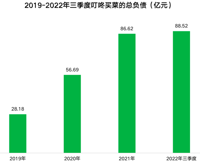 且,叮咚买菜的总负债规模仍在攀升,截至2022年三季度末,叮咚买菜的总负债金额达88.5亿元,再度创出历史新高,较年初增加2.1亿元。