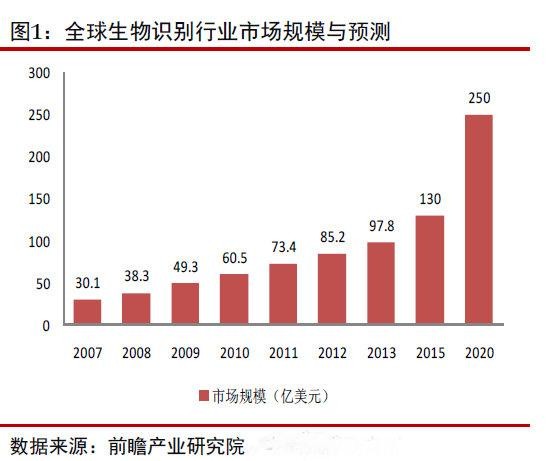 根据前瞻产业研究院发布的统计数据显示,2007 年至 2013 年六年期间,生物识别技术的全球市场规模年均增速为 21.7%,这在全球大部分行业增长率不到 5%的对比下实属罕见。 2015 年生物识别技术全球市场规模将达到 130 亿美元, 2020 年将达到 250 亿美元,5 年内年均增速约 14%。