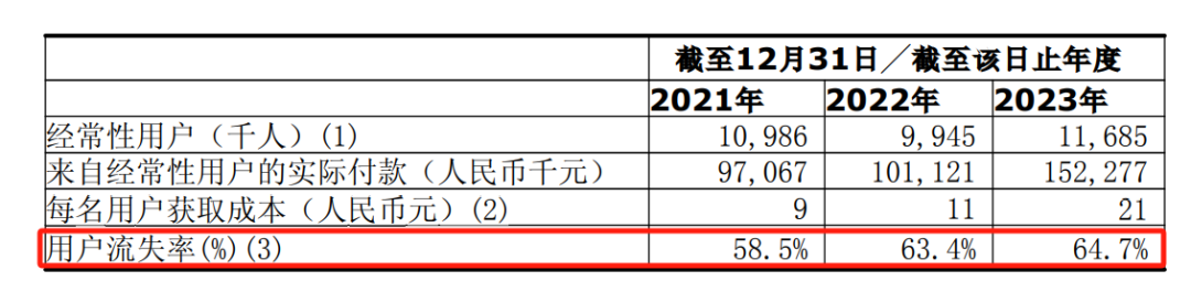 同时,其获客成本也在激增。2021年至2023年,公司每名用户的获客成本分别为9元、11元和21元,尤其是2023年获客成本同比增加90.91%。与此同时,趣致集团的用户流失率从2021年的58.5%增至2023年的64.7%。