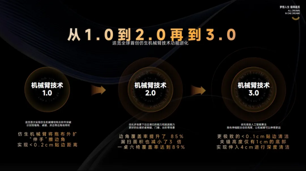 而且,追觅科技有一种“死磕”精神——消费者最大的痛点,就是产品研发的突破点。光一个边角覆盖率问题,追觅科技就做过37种方案,然后和消费者去沟通探讨。最终,经过上千种场景的测试验证,和数不清的设计和选材过程,由40多件专利全链路布局支撑的“仿生机械臂”技术,终于诞生了。