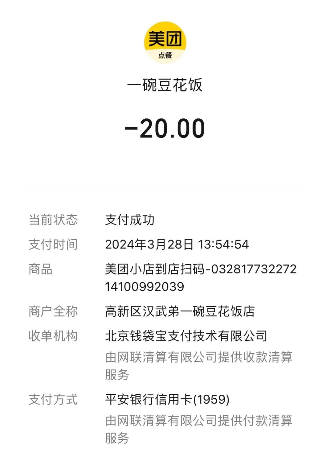 第二种,则是美团以小程序的方式入驻微信或支付宝。用户在线下消费点单结算时,通过小程序结算,此时在微信支付结果详情页面,会显示收单机构为美团自己的北京钱袋宝支付技术有限公司,而非财付通,并且是由网联清算有限公司提供收款清算服务。