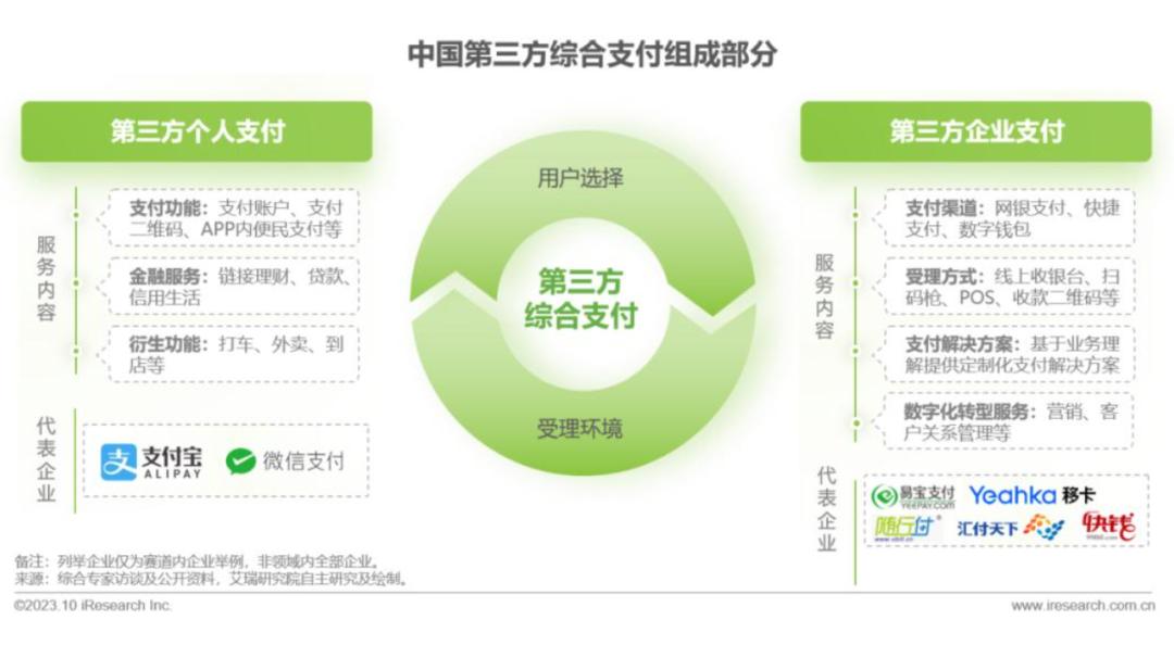 能够提供第三方支付服务的企业大致分为两类,一类是像支付宝,微信支付这两个主要面向自身C端用户,并链接各种自有平台的商户或其他平台商户的支付服务商;一类是像快钱,易联支付等第三方企业支付服务商。二者的区别是,有无自有C端用户。