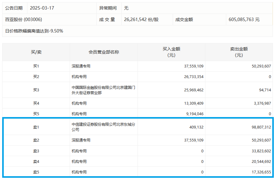 从盘后的龙虎榜数据来看,中信建投证券北京东城分公司成为卖出第一席位,卖出金额约9.88亿元;深股通专用席位(即北向资金)卖出约5.03亿元,买入约3.76亿元,净卖出约1.27亿元;卖出前五大席位有三个机构席位,合计卖出约7.16亿元。