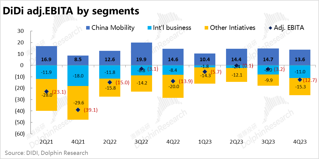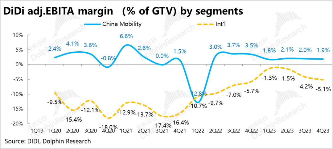 因此,在司机分成减少和乘客激励的增长大体对冲后,四季度滴滴国内出行业务的盈利水平环比略有下降,调整后EBITA利润率占GTV比重由2%环比下降到了1.9%。绝对额由14.7亿下降到13.6亿,无惊无喜。