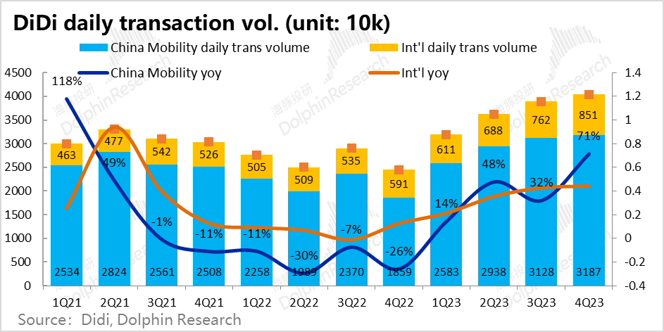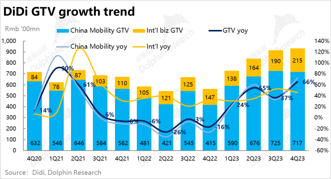 照例先看最关键的运营数据,继三季度滴滴国内成交额(GTV)成功走出疫情和下架的影响创出历史新高后,四季度国内出行GTV环比略微滑落1.1%到717亿,结合历史情况,4Q相比3Q略有下降属于常规的季节性波动。由于去年基数的巨大波动,使得大增的同比增速参考意义不大。