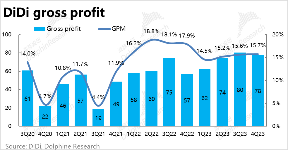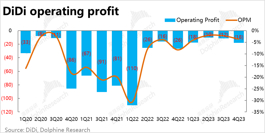 首先毛利上,由于收入占比约9成的国内网约车业务的成本主要由司机分成构成,因此毛利指标也是主要反映了司机分成比例的变化情况。因此本季毛利率由上季的15.6%环比小幅提升到15.7%,也可推测出给司机的分成大概率是下降的。费用层面,运营支持和管理费用环比大体持平。营销费用环比上季度小幅增长了一亿,虽然绝对额变化不大,但在GTV规模环比下降,营销支出却增长,仍是多少能体现滴滴在获客推广上在加力。另外,滴滴的研发费用也环比增长了3亿到24亿,但公司并未解释原因。