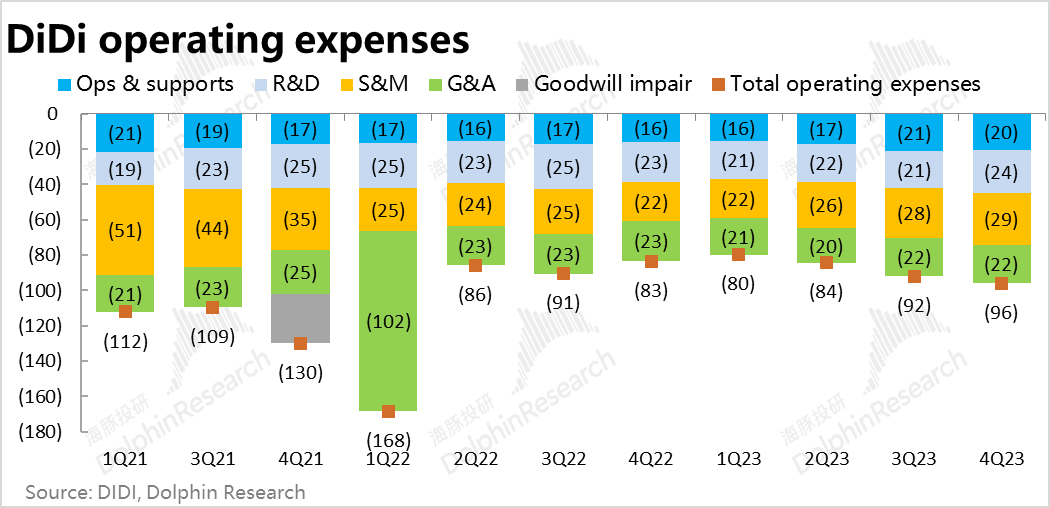 同时海外和新兴业务的亏损幅度本季有明显的扩大,本季海外业务EBITA亏损继续扩大到11亿。其他创新业务的EBITA亏损也扩大到了 15.3亿。两者合计亏损接近核心国内出行业务盈利的两倍,可谓是触目惊心的。据公司解释,海外业务亏损主要是为了拉增长,23年年初上线了新产品,后半年爬坡期投入较大,导致亏损由上半年单季2亿左右大幅增长到每季10亿左右。而创新业务亏损有智能车/驾驶业务的影响,由于此块业务已经出售,后续对利润的影响会减轻。三、海外&新业务亏损明显扩大,拖累公司整体利润以上我们按板块分析了国内出行和海外业务的经营、营收和利润情况。以下来看本季的成本和费用变动情况。