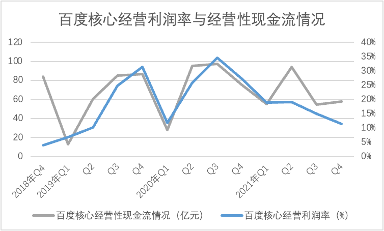 以上是从损益表角度思考,接下来我们再从现金流角度进行验证。我们整理了百度核心经营利润率与经营性现金流的关系,见下图