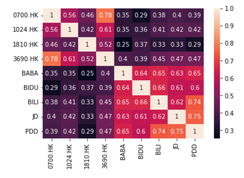 我们再将快手,美团,京东,拼多多等美股和港股公司都纳入框架,再对股价走势相关性进行分析,见下图