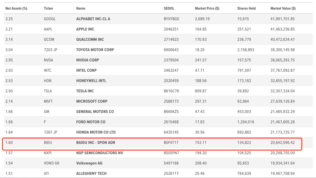 该ETF由于纳入了成分股足够多,又包括软硬件以及整车,新能源等不同板块,且又是美元ETF,能被纳入成分股对于百度这家互联网公司的定性转变是有很大帮助的。