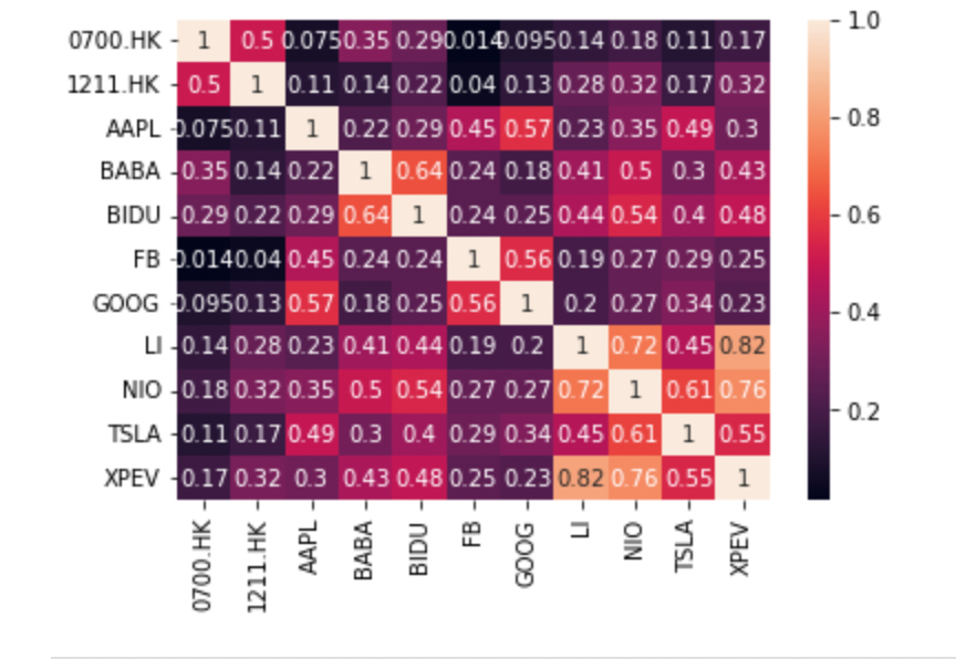 上述采样标准中,既有美股头部谷歌、FB,苹果等企业,亦有中概股的代表公司,又将我国赴美上市造车企业“蔚小理”纳入框架内。作为中概互联网企业,我们本以为百度股价相关性会更偏向于科技类公司,而在上图中,与“蔚小理”和特斯拉相关性更为明确,这是让我们很吃惊的。