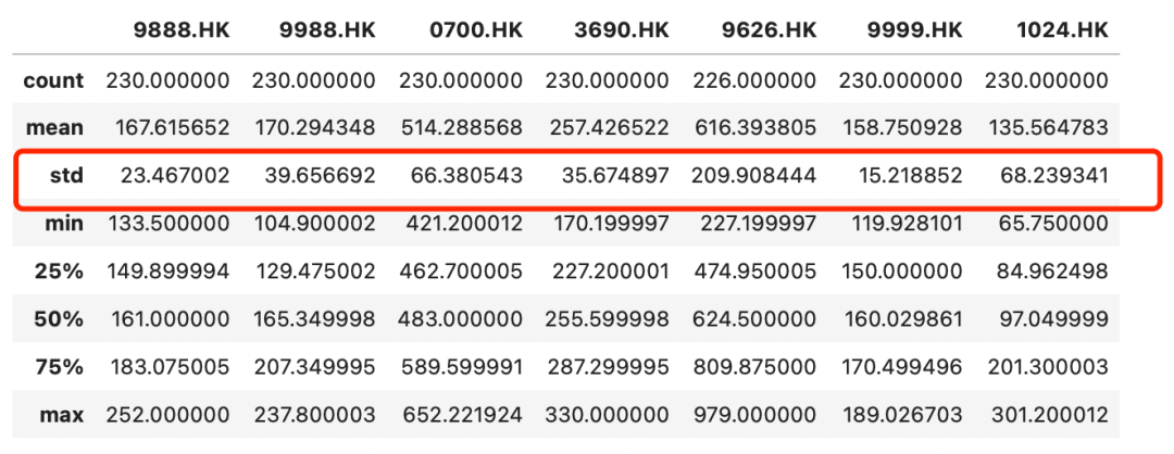 其一,从互联网机构投资者角度考虑,在跌宕起伏的2021年,行业面临巨大不确定性,表现为股价标准差急剧放大,以分散化投资为主要策略的机构投资者此时若要对冲风险,就要尽量降低投资组合的波动性,也就是向低标准差股价侧重,以规避风险,于是我们也就整理了恒生科技成分股的代表企业,见下图