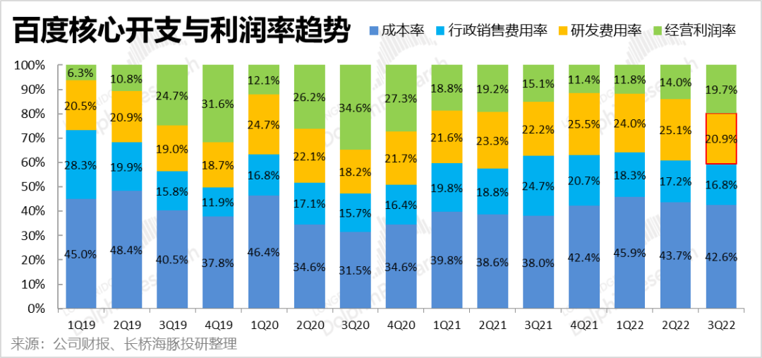 经营费用上,百度进入2022年已经进入明显的降本增效周期,销售费用率一直在持续收缩当中,今年三季度还未满一年,因此销售行政的开支依然在收缩当中,三季度同比收缩了31%。