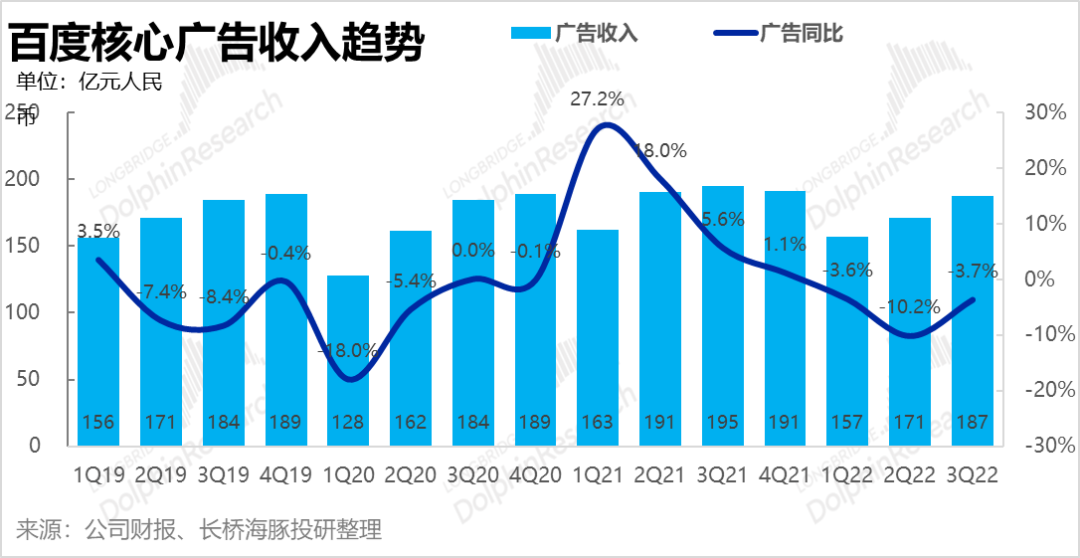 因为市场预期足够低、去年基数也比较友好,实际百度核心的广告收入并没有那么差,海豚君基于百度财报核算出来的百度核心广告收入是187亿,同比下跌-3.7%,而大多数预期基本预期在-6%到-7%的收缩幅度。