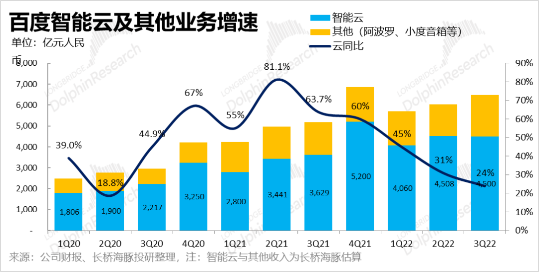 但这个季度,创新业务收入支撑——智能云业务这个季度增速在走出上海疫情之后,还在进一步放缓,增长只有24%,智能云这个季度收入大约是45亿,应该是跟腾讯阿里一样去虚肥,把一些效益差的项目都停掉了。